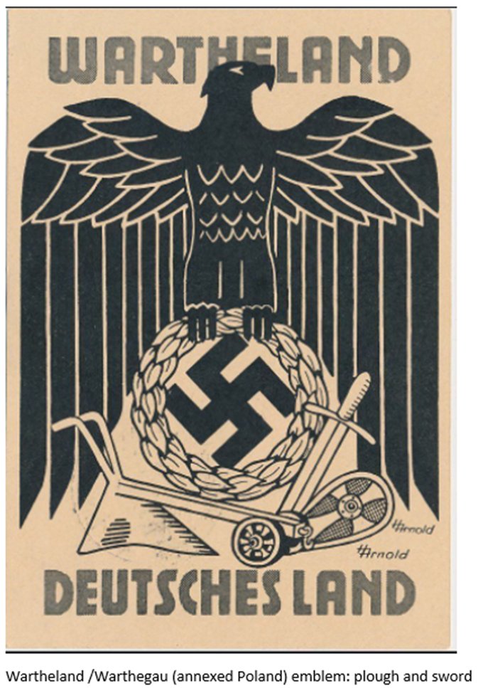 The regime was grooming these 15-year-olds to be elite farming families and communities for Germany’s eastern borders at war’s end. The vision called for a genetically healthy German peasant stock in fortified agricultural villages along Warthegau’s border. Accordingly, Warthegau’s emblem was the plough and sword, Mennonite resettlement in Warthegau, and perhaps later again back to Ukraine, was to help fulfill this plan. “This future, too, can only be a soldierly future. … Only a soldierly generation proud of its military will know how to preserve the heritage of the victory. When these young people will one day live as soldier-farmers (Wehrbauern) in the German East on their own land, we will no longer have to worry about our German future” (note 8). The Wehrbauer ideal—a plough in one hand and the sharpened sword in the other (note 9)—was introduced in HJ and in the Landjahr programs in Warthegau.